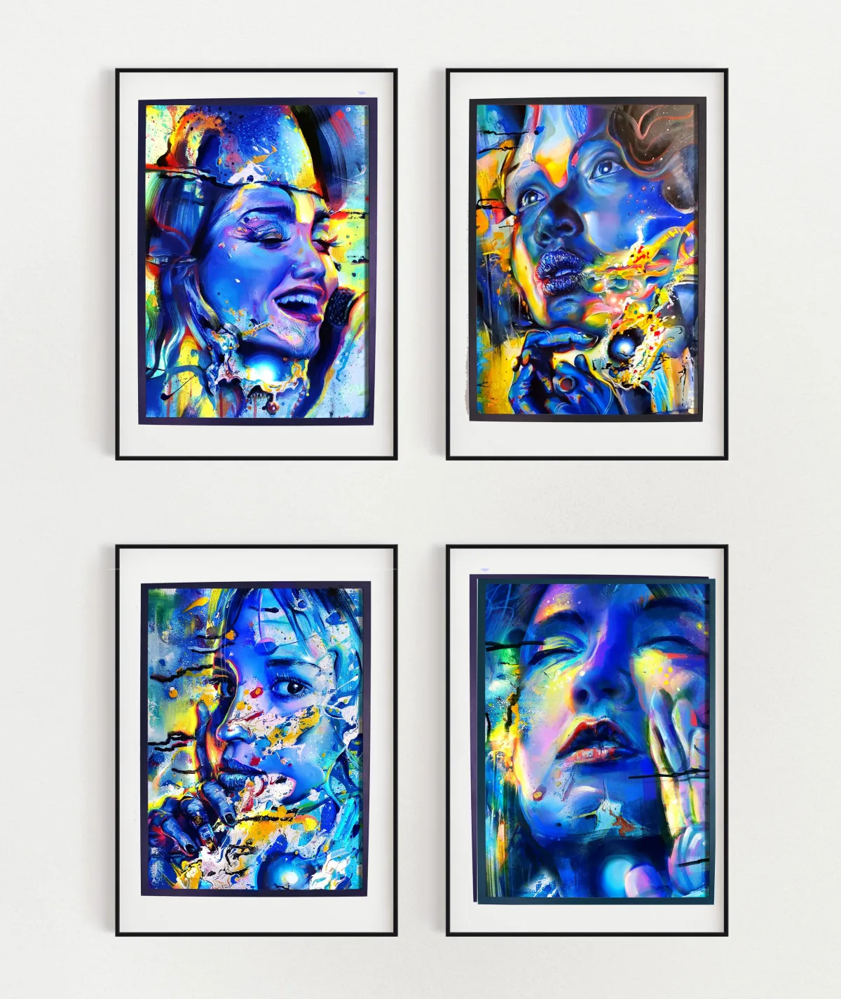Below this letter I've laid out 4 prints from the "Out of the Blues" Collection, each telling a different story of the power of voice and how to get "out of the blues", by embracing the blues of the throat chakra.
